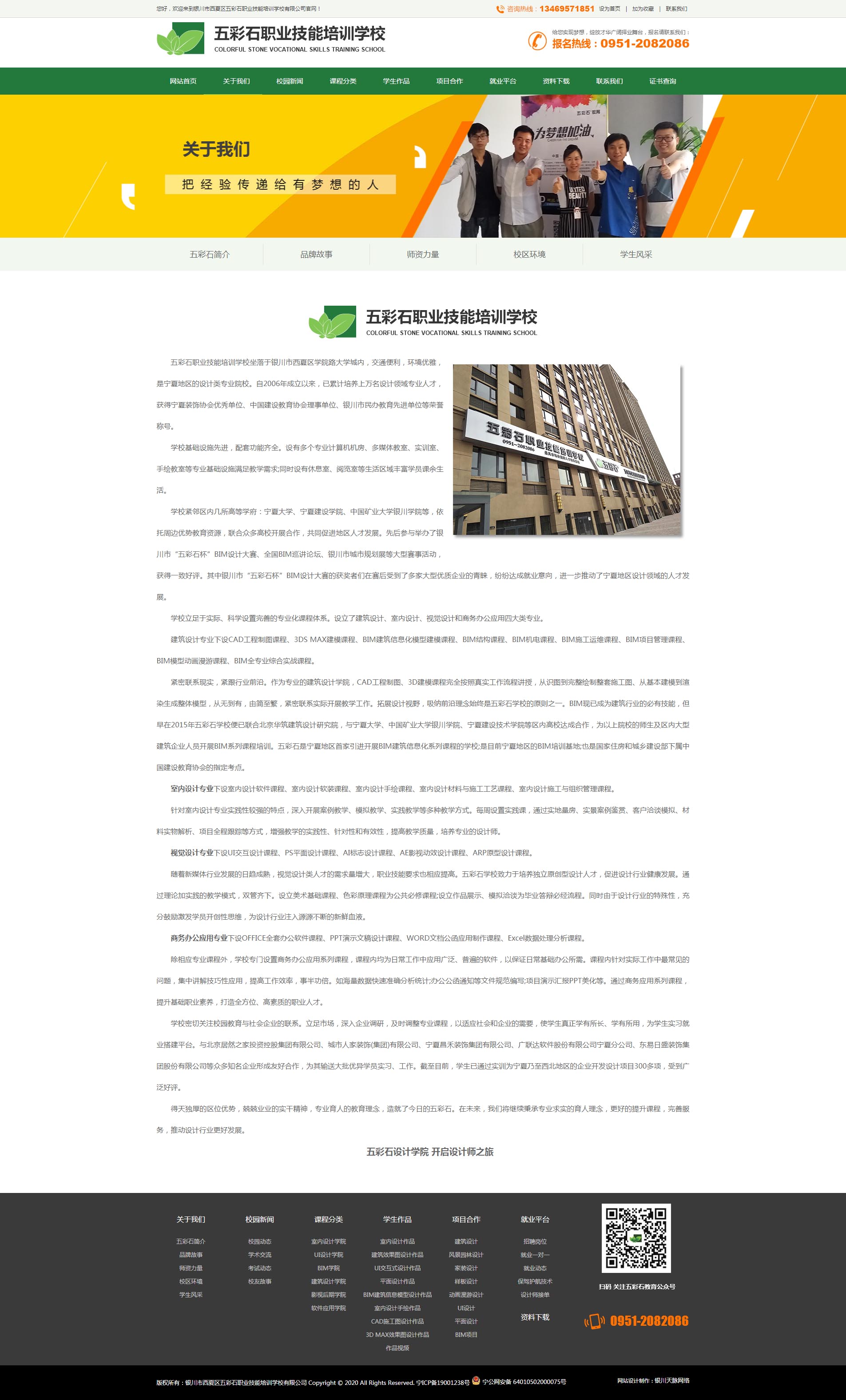 五彩石职业技能培训学校坐落于银川市西夏区学院路大学城内,交通便利,环境优雅,是宁夏地区的设计类专业院校。自2006年成立以来,已累计培养上万名设计领域专业人才,获得宁夏装饰协会优秀单位、中国建设教育协会理事单位、银川市民办教育先进单位等荣誉称号。